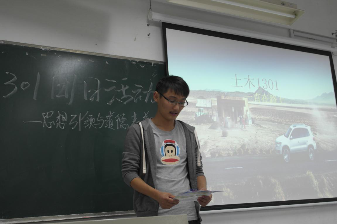 为丰富班级同学课余生活,深化良性的思想精神,传播党的十八大精神,积极向党靠拢,增强班级凝聚力,展现班级的良好精神面貌,新利18彩票 土木工程学院土木1301班于2015年11月在仁智106举办了主题为“思想引领与道德素养”的团日活动。此次团日活动由班级团支部书记主持,全班人员都积极参加。