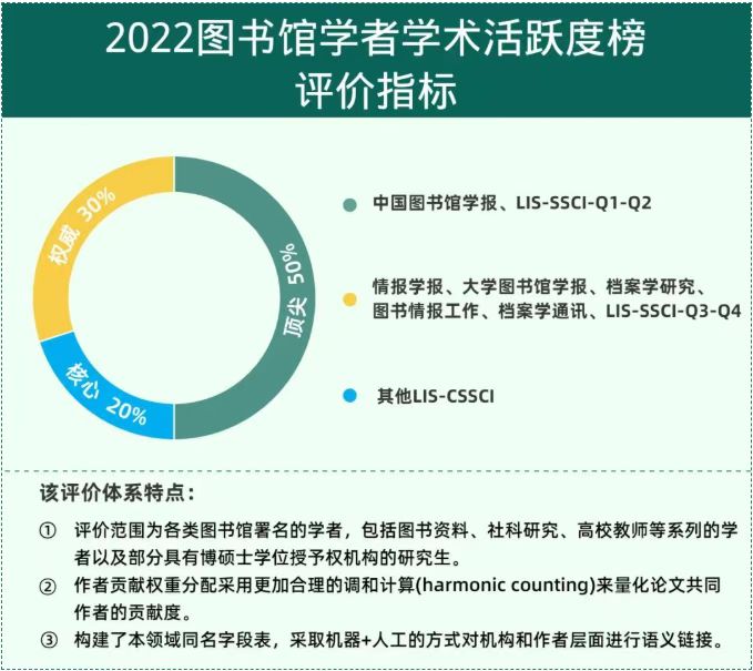 该榜单是首个针对图书馆学者层面学术活跃度进行综合评价的指数,评价体系以期刊发文能力为首要测度,将国内外图书情报与档案管理领域的期刊分为三个等级:顶尖、权威、核心,选取标准主要参考SCI/SSCI、CSSCI以及第四轮学科评估A类期刊目录,并采取期刊+作者综合权重的方式,旨在给出一个具有对标基准、多层次、分权重、符合图书馆实务界特色的综合评议依据。
