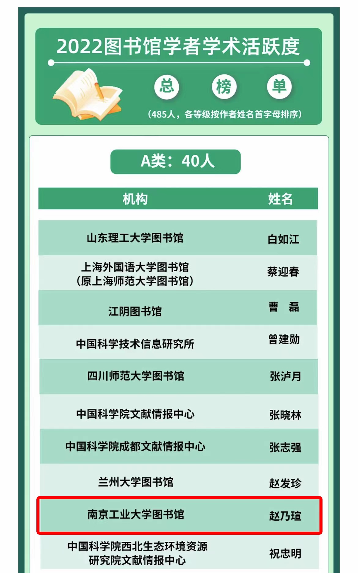 6月13日,上海市海峡两岸教育交流促进会新文科专委会正式发布“2022图书馆学者学术活跃度榜”。我校图书馆赵乃瑄入选A类学者,在高校图书馆(本科)中排名第七。俞琰入选B类学者,李杉杉入选C类学者,冯君、金洁琴入选D类学者。我校图书馆也是全国20所入选机构之一,显示了我校图书馆学术能力较强,学术研究活跃。